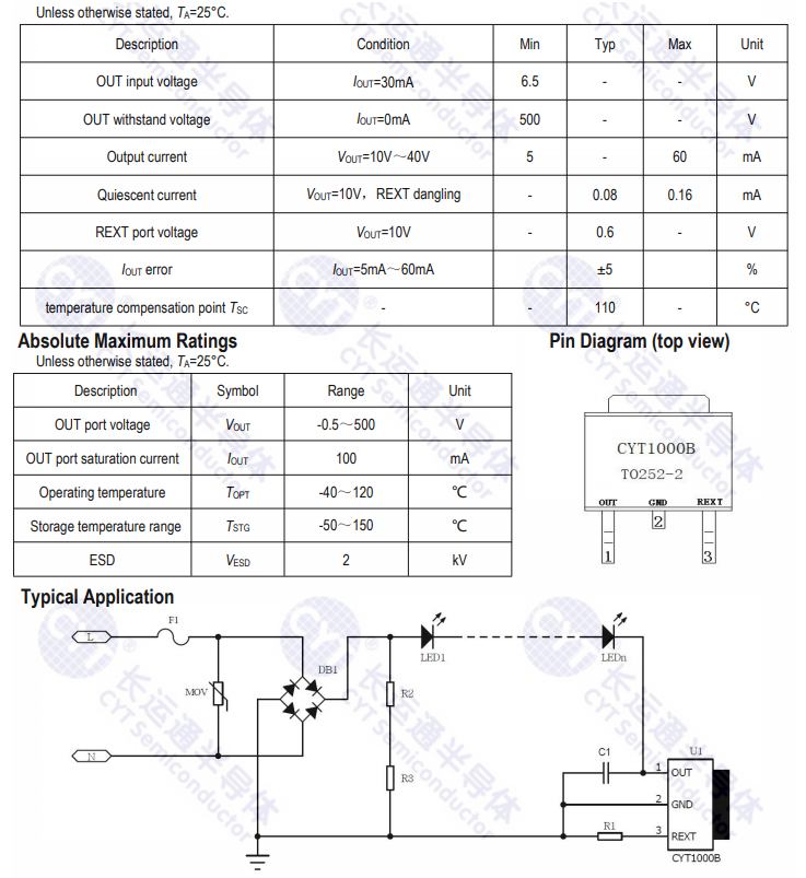 CYT1000B is a Single Channel high voltage linear constant current LED driver, which integrates 700V high voltage MOS. The output current can be set through an external resistor between 5mA and 60mA.