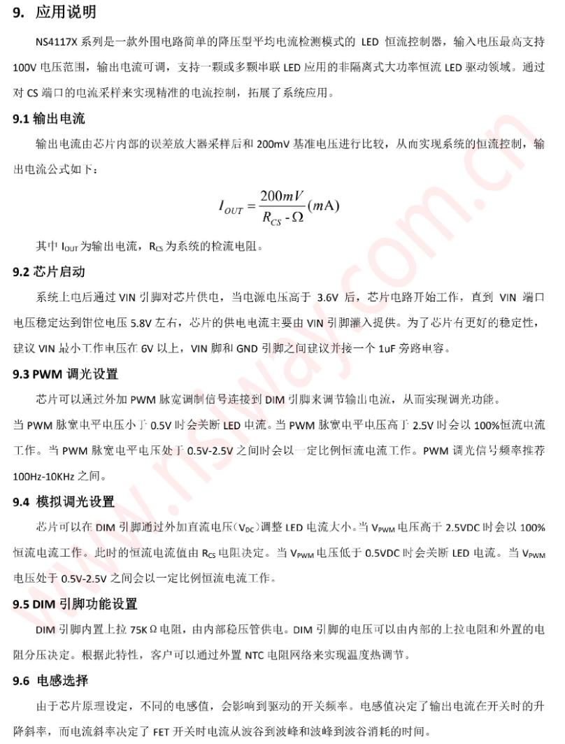 NS4117X系列是一款外圍電路簡單的降壓型平均電流檢測模式的LED恒流控制器,輸入電壓最高支持100V電壓范圍,輸出電流可調,支持一顆或多顆串聯LED應用的非隔離式大功率恒流LED驅動領域。芯片開關頻率可變,最高支持1MHz。采用平均電流檢測模式實現輸出恒流。芯片通過DIM引腳復用的方式可以實現LED開/關、模擬調光和PWM調光功能。芯片內部集成了LDO,過溫調節等功能,減小了外圍電路元件數量并提高了系統的可靠性。NS4117X系列采用了SOT23-6L封裝。