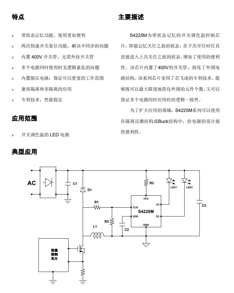 S4225M是帶狀態記憶功能的開關調色溫控制芯片,內部設定狀態切換窗口時間Tsw(典型值64S)關燈時間超過狀態切換窗口時間芯片會記住關燈前的狀態,下次開燈時直接呈現關燈前的狀態;關燈時間小于狀態切換窗口時間開燈則切換到下一個色溫狀態,增加了使用的便利性。 S4225M通過檢測脈沖信號來判斷開關機狀態,確保多個電源同時應用時的邏輯一致性,而且可以兼容 Flyback、Buck-Boost、Buck及線性等多種 LED 驅動方案。