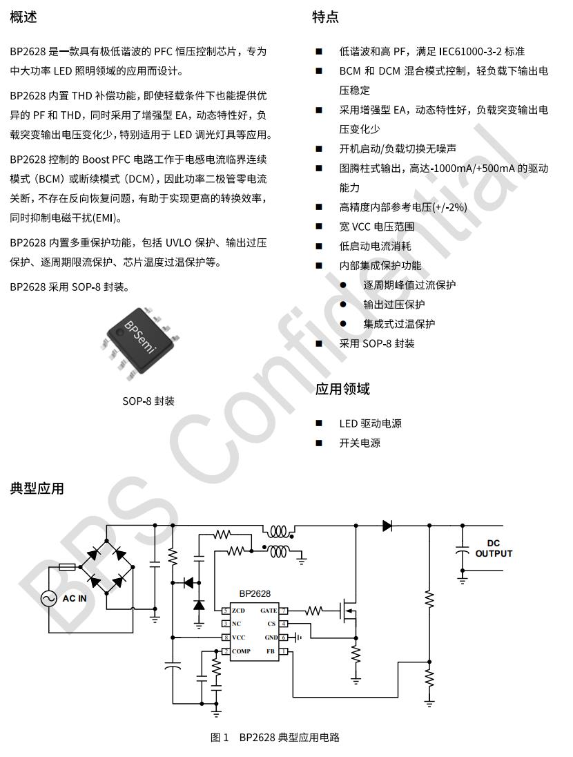 BP2628是一款具有極低諧波的PFC恒壓控制芯片,專為中大功率LED照明領域的應用而設計。BP2628內置THD補償功能,即使輕載條件下也能提供優異的PF和THD,同時采用了增強型EA,動態特性好,負載突變輸出電壓變化少,特別適用于LED調光燈具等應用。