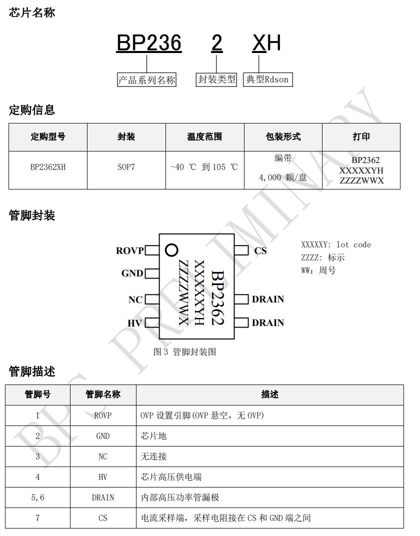 | BP2362JH | SOP7 | Y | 1.9Ω | 600V | External | Y | - | - | <270 |