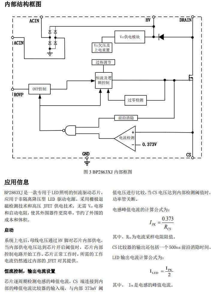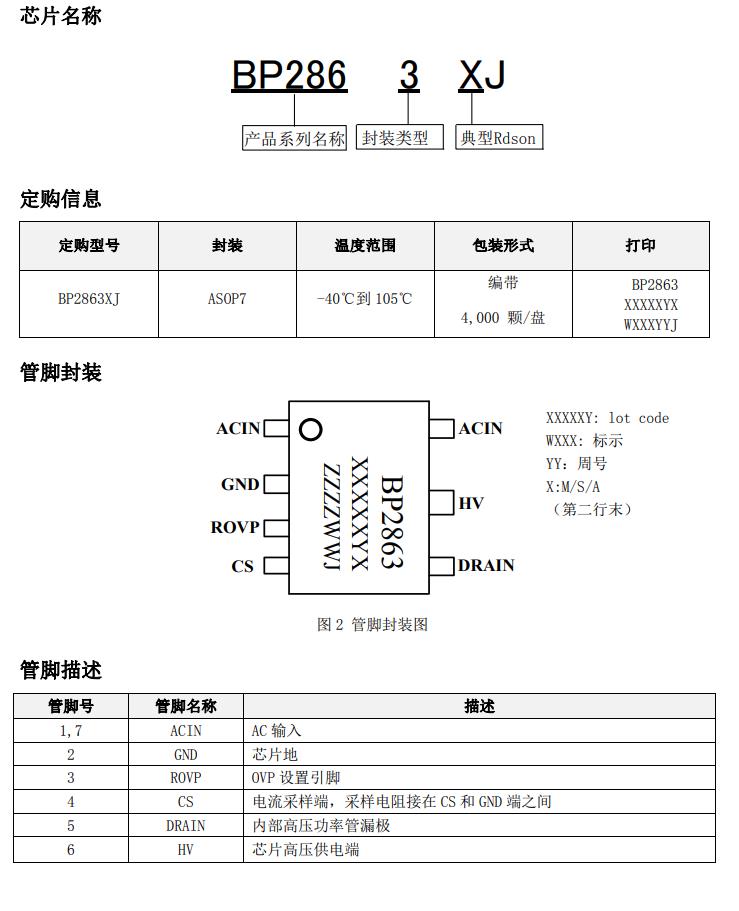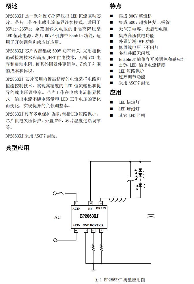 BP2863XJ 芯片采用內置高精度的電流采樣電路和 恒流控制技術,實現高精度的 LED 恒流輸出和優 異的線電壓調整率。芯片工作在電感電流臨界模 式,輸出電流不隨電感量和 LED 工作電壓的變化 而變化,實現優異的負載調整率。 BP2863XJ具有多重保護功能,包括LED短路保護, 芯片供電欠壓保護,外置 OVP,芯片溫度過熱調節 等。 BP2863XJ 采用 ASOP7 封裝。