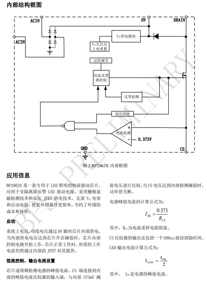 BP2863X 是一款降壓型 LED 恒流驅(qū)動(dòng)芯片。芯片工 作在電感電流 臨界連續(xù) 模 式 , 適 用 于 85Vac~265Vac 全范圍輸入電壓的非隔離降壓型 LED 恒流電源。 BP2863X 芯片內(nèi)部集成 500V 功率開關(guān),采用柵極 退磁檢測(cè)技術(shù)和高壓 JFET 供電技術(shù),無(wú)需 VCC 電 容和啟動(dòng)電阻,使其外圍器件更簡(jiǎn)單,節(jié)約了外圍 的成本和體積。