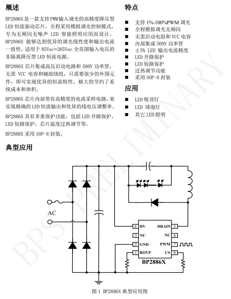 BP2886X 具有多重保護功能,包括 LED 開路保護, LED 短路保護,芯片溫度過熱調節等。 BP2886X 采用 SOP-8 封裝。