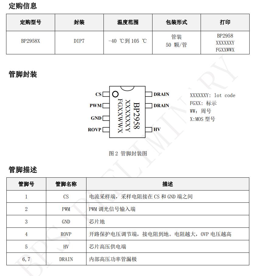 | BP2958X | DIP7 | 0.5 | Buck | <50W | 500V/4.8Ω/3Ω/2Ω | Y | PWM |