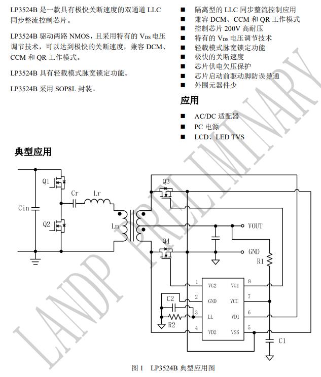 LP3524B 是一款具有極快關(guān)斷速度的雙通道 LLC 同步整流控制芯片。 LP3524B 驅(qū)動(dòng)兩路 NMOS,且采用特有的 VDS電壓 調(diào)節(jié)技術(shù),可以達(dá)到極快的關(guān)斷速度,兼容 DCM、 CCM 和 QR 工作模式。