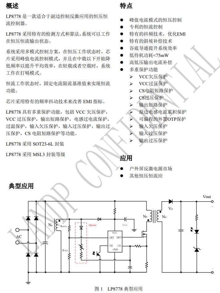 LP8778 是一款適合于副邊控制反激應(yīng)用的恒壓恒 流控制器。 LP8778 采用特有的檢測(cè)方式和算法,系統(tǒng)可以工作 在恒壓恒流輸出狀態(tài)。 系統(tǒng)采用多模式控制方案,在恒壓工作狀態(tài)時(shí),芯 片采用峰值電流控制模式,并且在中載以下開始降 低頻率以提升平均效率,在輕載或者空載時(shí),系統(tǒng) 工作在打嗝模式。 恒流工作狀態(tài)時(shí),固定電流限流基準(zhǔn)值來(lái)實(shí)現(xiàn)恒流 功能。 芯片采用特有的頻率抖動(dòng)技術(shù)來(lái)改善 EMI 指標(biāo)。