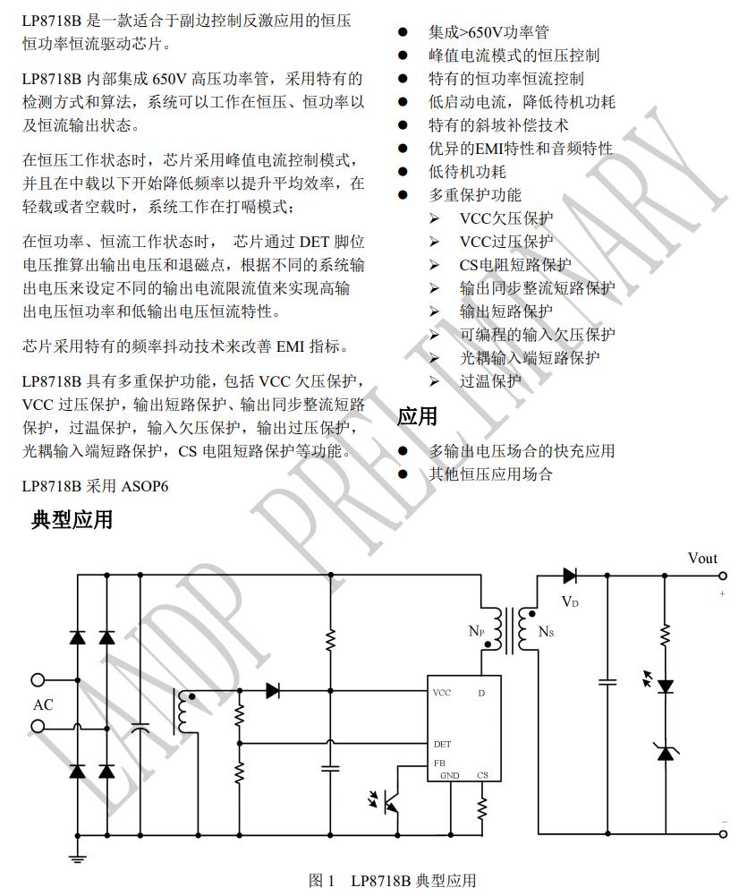LP8718B 是一款適合于副邊控制反激應用的恒壓 恒功率恒流驅動芯片。 LP8718B 內部集成 650V 高壓功率管,采用特有的 檢測方式和算法,系統可以工作在恒壓、恒功率以 及恒流輸出狀態。 在恒壓工作狀態時,芯片采用峰值電流控制模式, 并且在中載以下開始降低頻率以提升平均效率,在 輕載或者空載時,系統工作在打嗝模式; 在恒功率、恒流工作狀態時, 芯片通過 DET 腳位 電壓推算出輸出電壓和退磁點,根據不同的系統輸 出電壓來設定不同的輸出電流限流值來實現高輸 出電壓恒功率和低輸出電壓恒流特性。 芯片采用特有的頻率抖動技術來改善 EMI 指標。