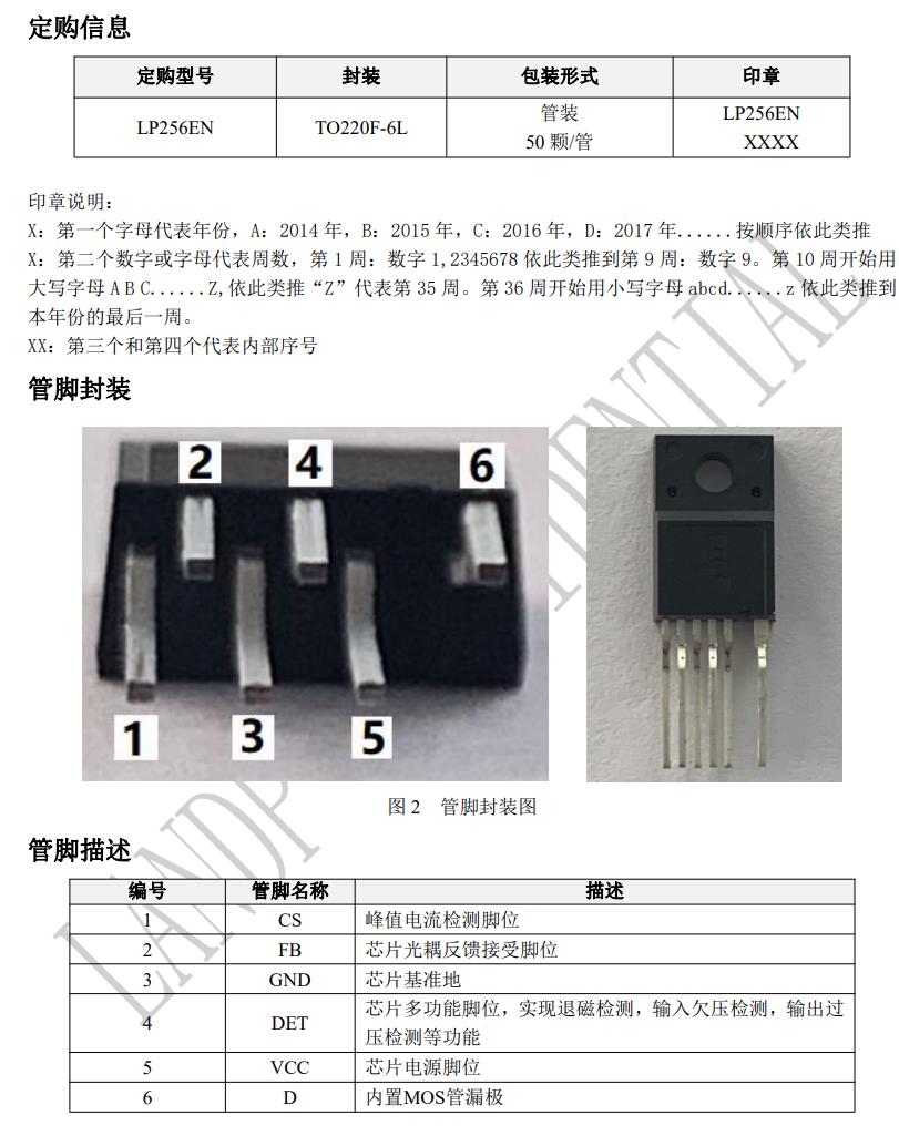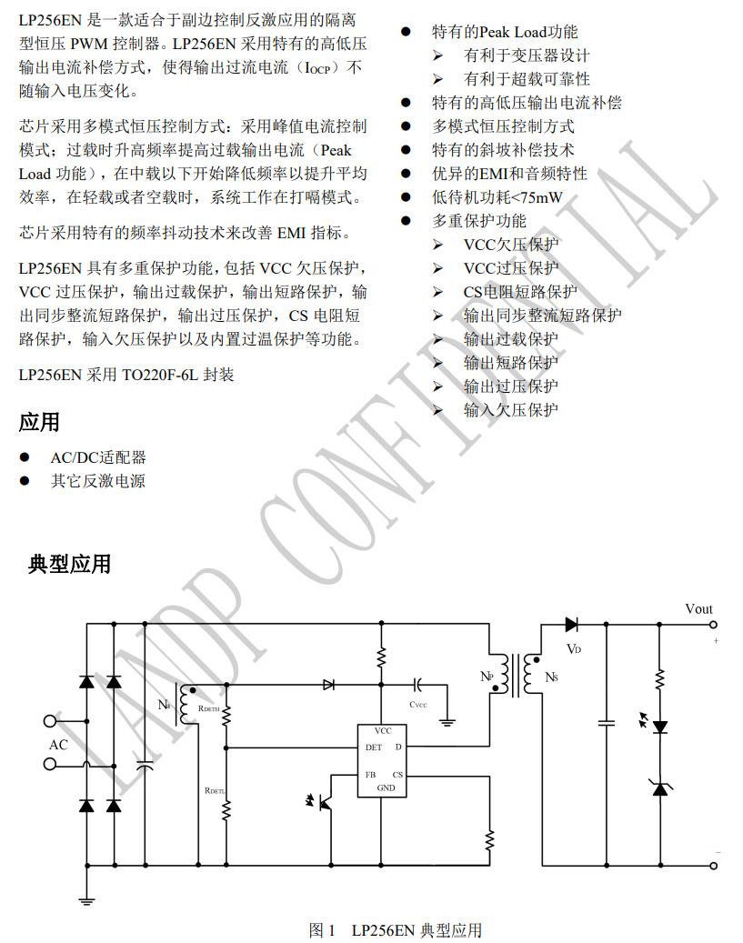 LP256EN 具有多重保護功能,包括 VCC 欠壓保護, VCC 過壓保護,輸出過載保護,輸出短路保護,輸 出同步整流短路保護,輸出過壓保護,CS 電阻短 路保護,輸入欠壓保護以及內(nèi)置過溫保護等功能。