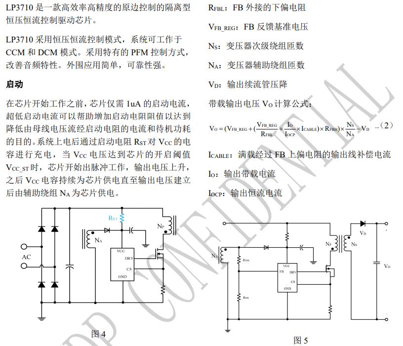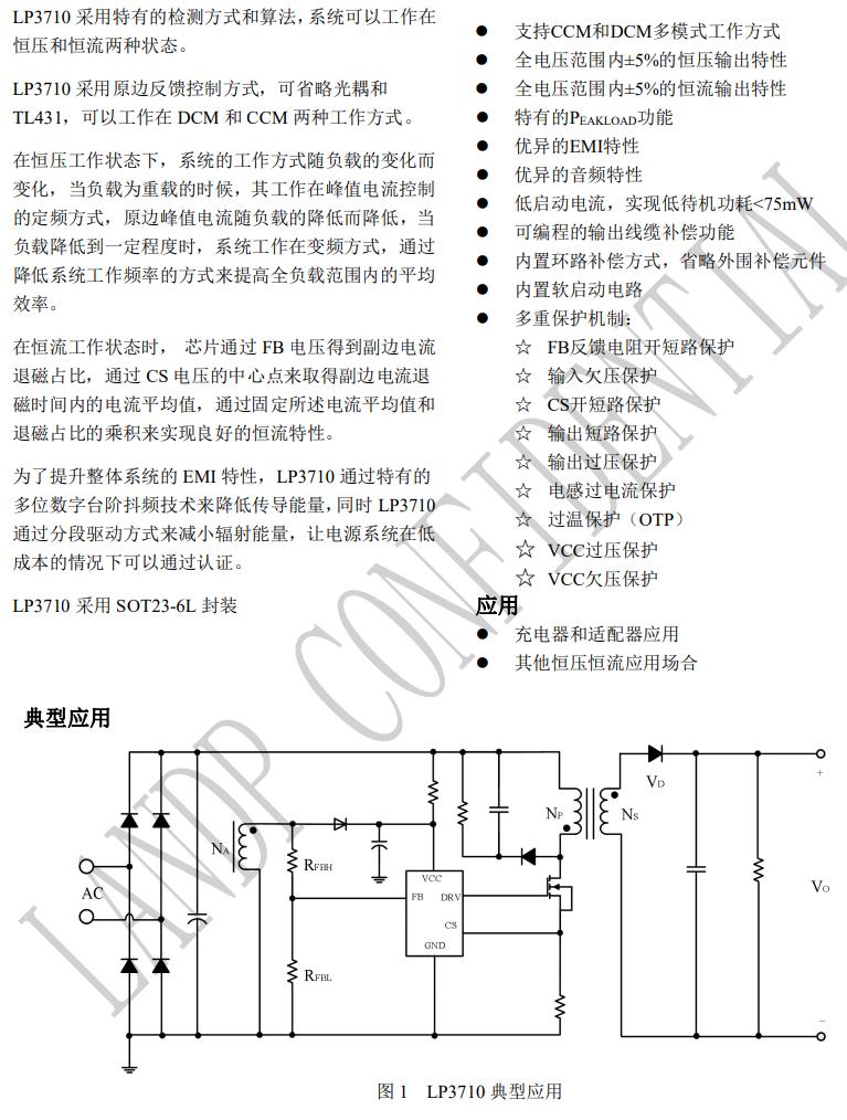 LP3710 采用特有的檢測方式和算法,系統可以工作在 恒壓和恒流兩種狀態。 LP3710 采用原邊反饋控制方式,可省略光耦和 TL431,可以工作在 DCM 和 CCM 兩種工作方式。