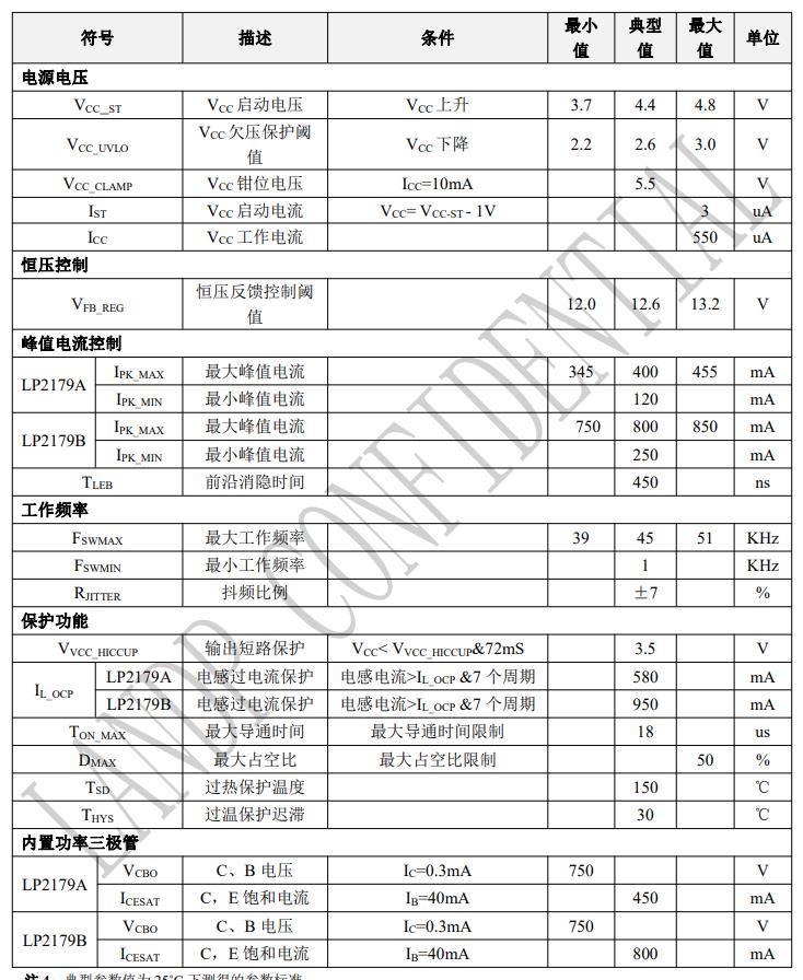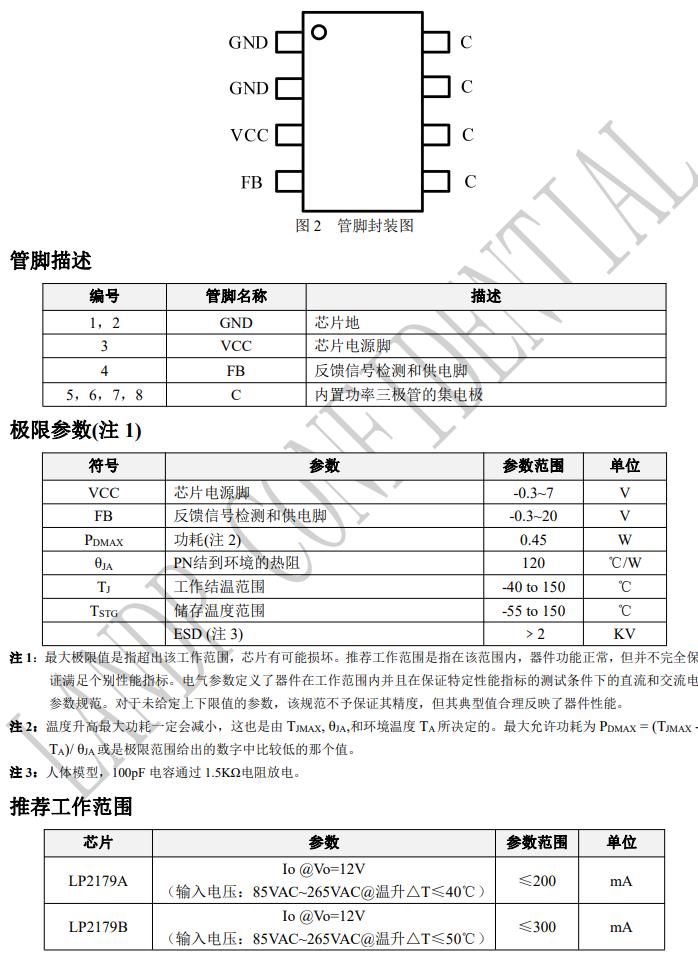 LP2179 內部集成高壓功率管,采用恒壓控制模式, 系統可工作于 CCM 和 DCM 模式。采用特有的 PFM 控制方式,改善音頻特性。 內置特有的峰值電流控制,無需 CS 電阻;內置啟 動電路,無需啟動電阻。外圍應用簡單,可靠性強。