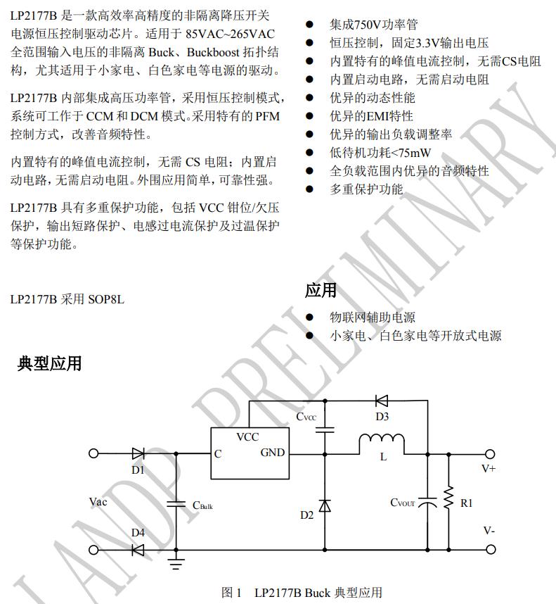 LP2177B 是一款高效率高精度的非隔離降壓開關 電源恒壓控制驅動芯片。適用于 85VAC~265VAC 全范圍輸入電壓的非隔離 Buck、Buckboost 拓撲結 構,尤其適用于小家電、白色家電等電源的驅動。