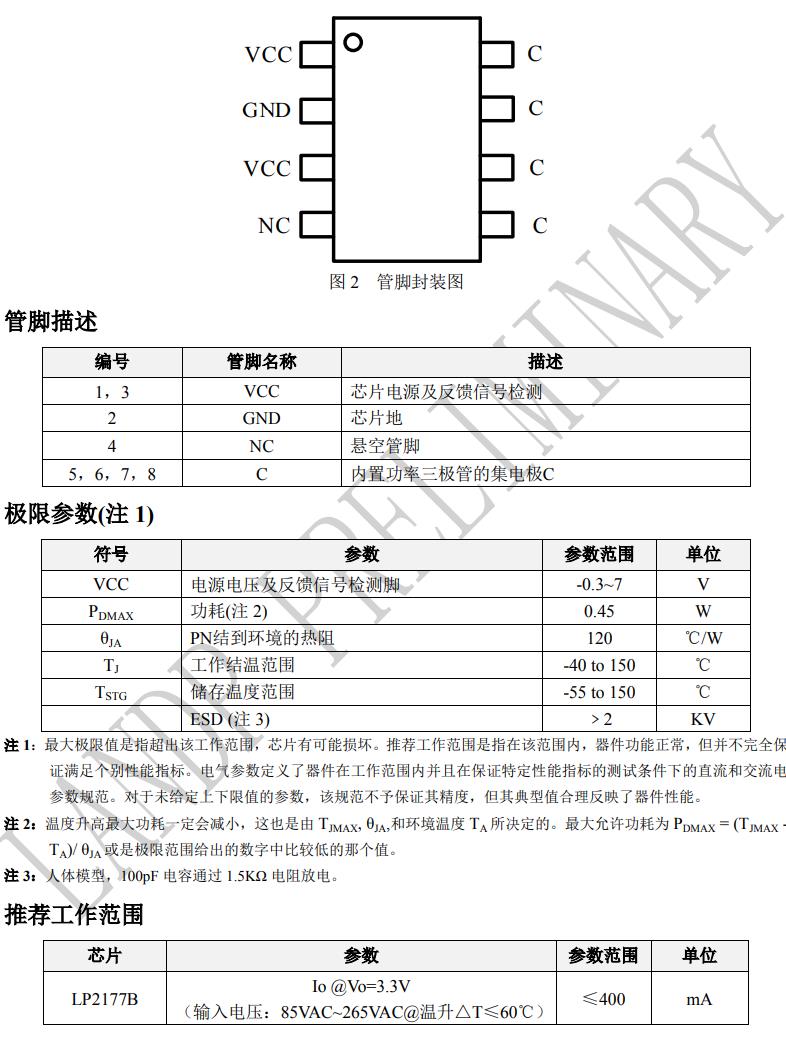 特點 ? 集成750V功率管 ? 恒壓控制,固定3.3V輸出電壓 ? 內置特有的峰值電流控制,無需CS電阻 ? 內置啟動電路,無需啟動電阻