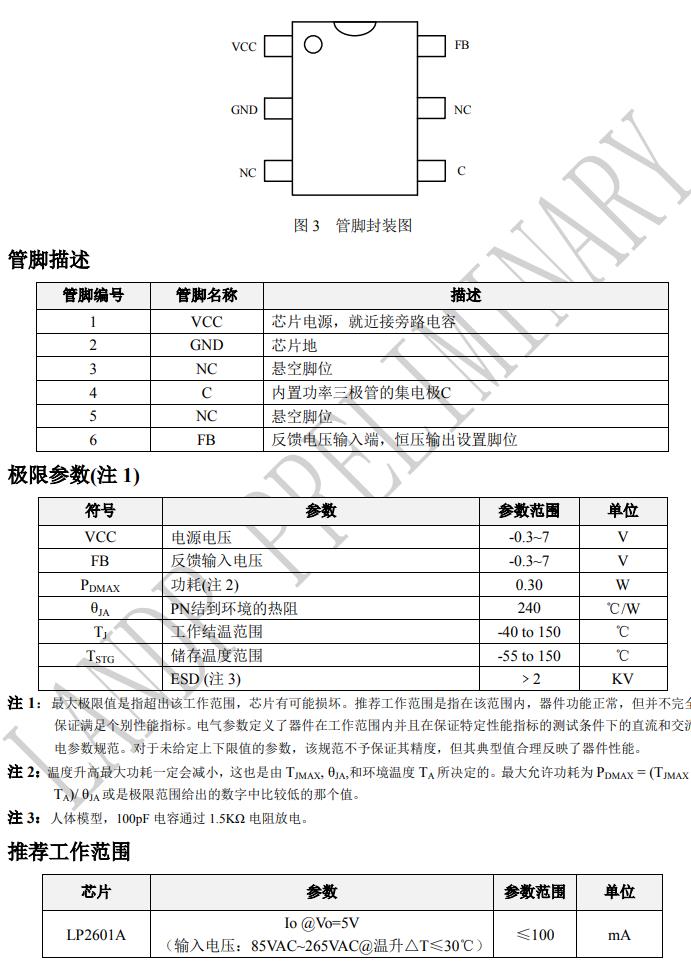 LP2601 內部集成高壓功率管,采用恒壓控制模式, 系統工作在電感電流臨界模式。方案可靠性強,外 圍應用簡單。 LP2601 具有多重保護功能,包括 VCC 鉗位/欠壓保 護,過溫保護等保護功能。