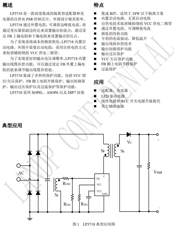 LP3718 是一款高度集成的隔離型適配器和充 電器的自供電 PSR 控制芯片,外圍設計極其簡單。