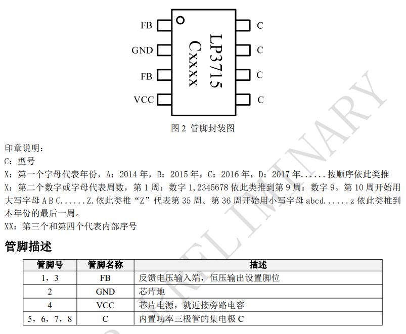 | LP3715NCK | 750 | 630 | No | 140 | 30 | 12 | 200 | 外置 | 50 | Low | SOP8L | 10W |
