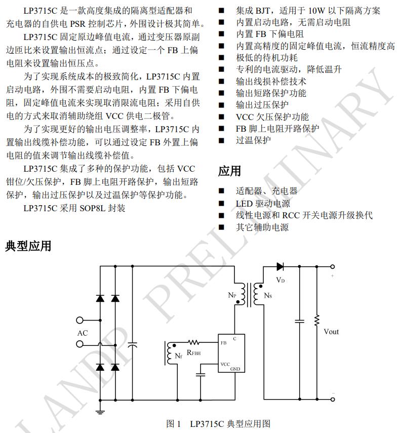 LP3715 是一款高度集成的隔離型適配器和 充電器的自供電 PSR 控制芯片,外圍設計極其簡單。 LP3715 固定原邊峰值電流,通過變壓器原副 邊匝比來設置輸出恒流點;通過設定一個 FB 上偏 電阻來設置輸出恒壓點。