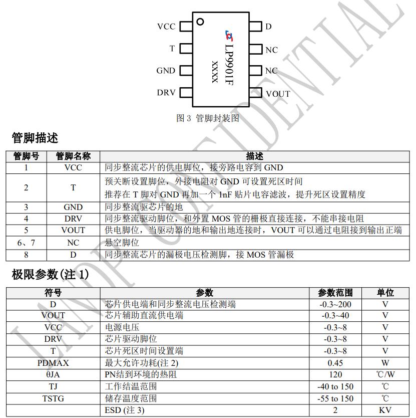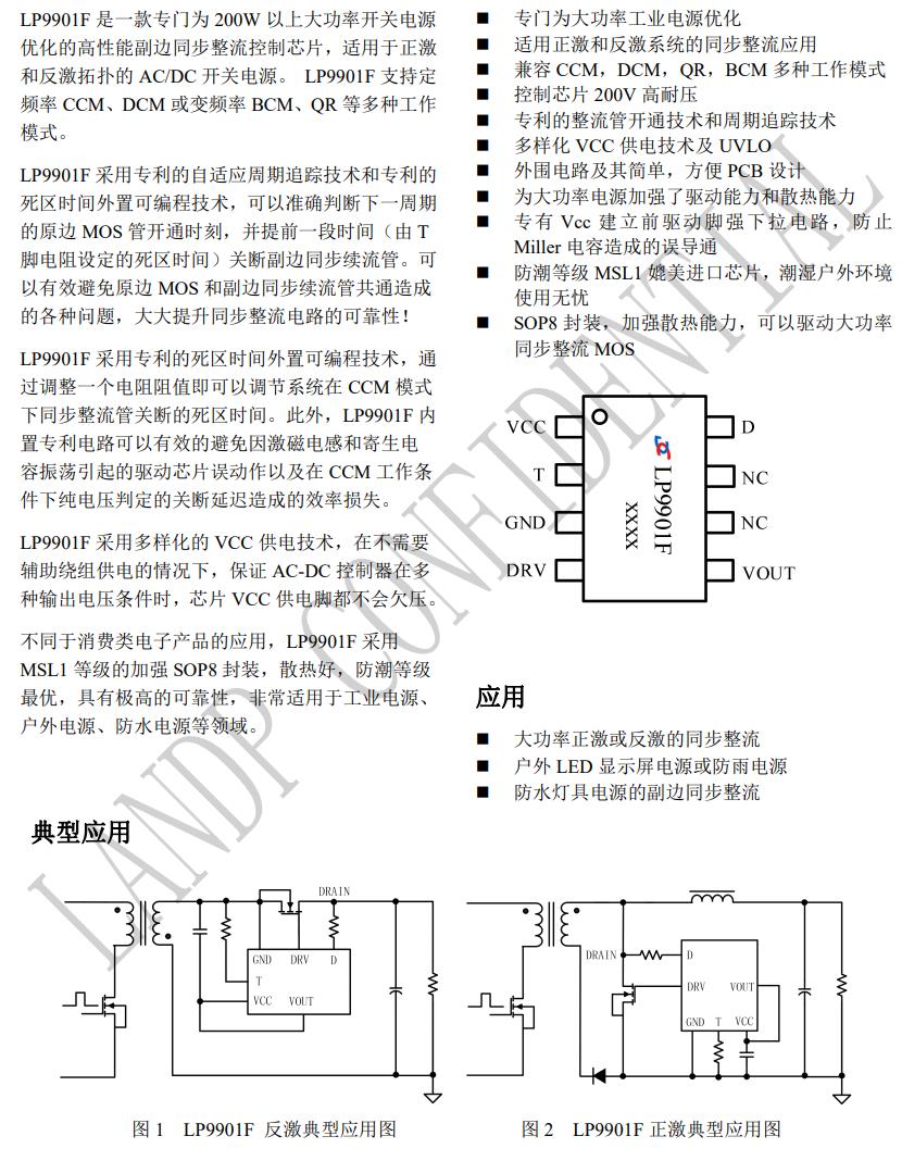 LP9901 支持定 頻率 CCM、DCM 或變頻率 BCM、QR 等多種工作 模式。 LP9901F 采用專利的自適應周期追蹤技術和專利的 死區時間外置可編程技術,可以準確判斷下一周期 的原邊 MOS 管開通時刻,并提前一段時間(由 T 腳電阻設定的死區時間)關斷副邊同步續流管。