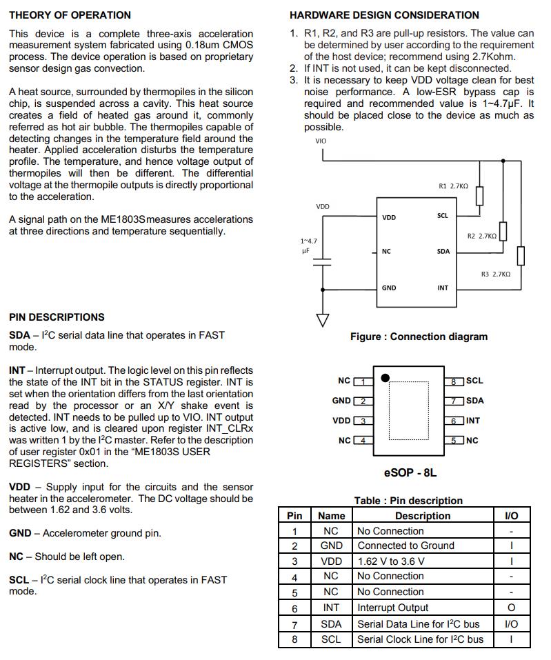 ? Ultra Low Cost ? Most Advantaged Technology in Industry ? MEMS Sensor with On-Chip Signal Processing ? >200,000g Shock Survival Rating of Sensing Structure ? 12-bit Signal Output for X, Y and Z Axes ? Full Scale Range ± 2g, ± 4g and ± 8g ? 8-bit Temperature Output ? eSOP 8L Package ? 6-Position Orientation Detection ? Shake Detection with Interrupt ? Programmable Shake Detection Threshold ? I 2C Slave, FAST (≤400 KHz) Mode Interface ? 1.8~3.6V Single Supply Continuous Operation ? 1.8V Compatible I/O ? Embedded Power Up/Down Mode