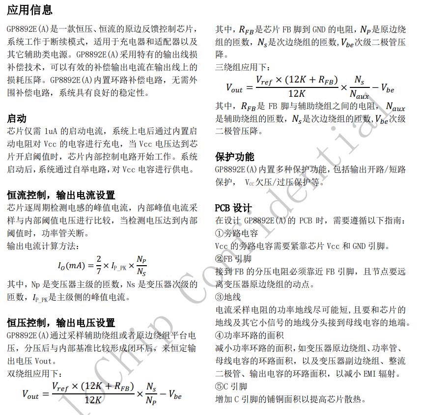 GP8892E(A)是一款自供電恒壓、恒流的原邊反饋控制芯片,適用于充電器和適配器。GP8892E(A)采用特有的輸出線損補償技術(shù),可以有效的補償輸出電流在輸出線上的損耗壓降。