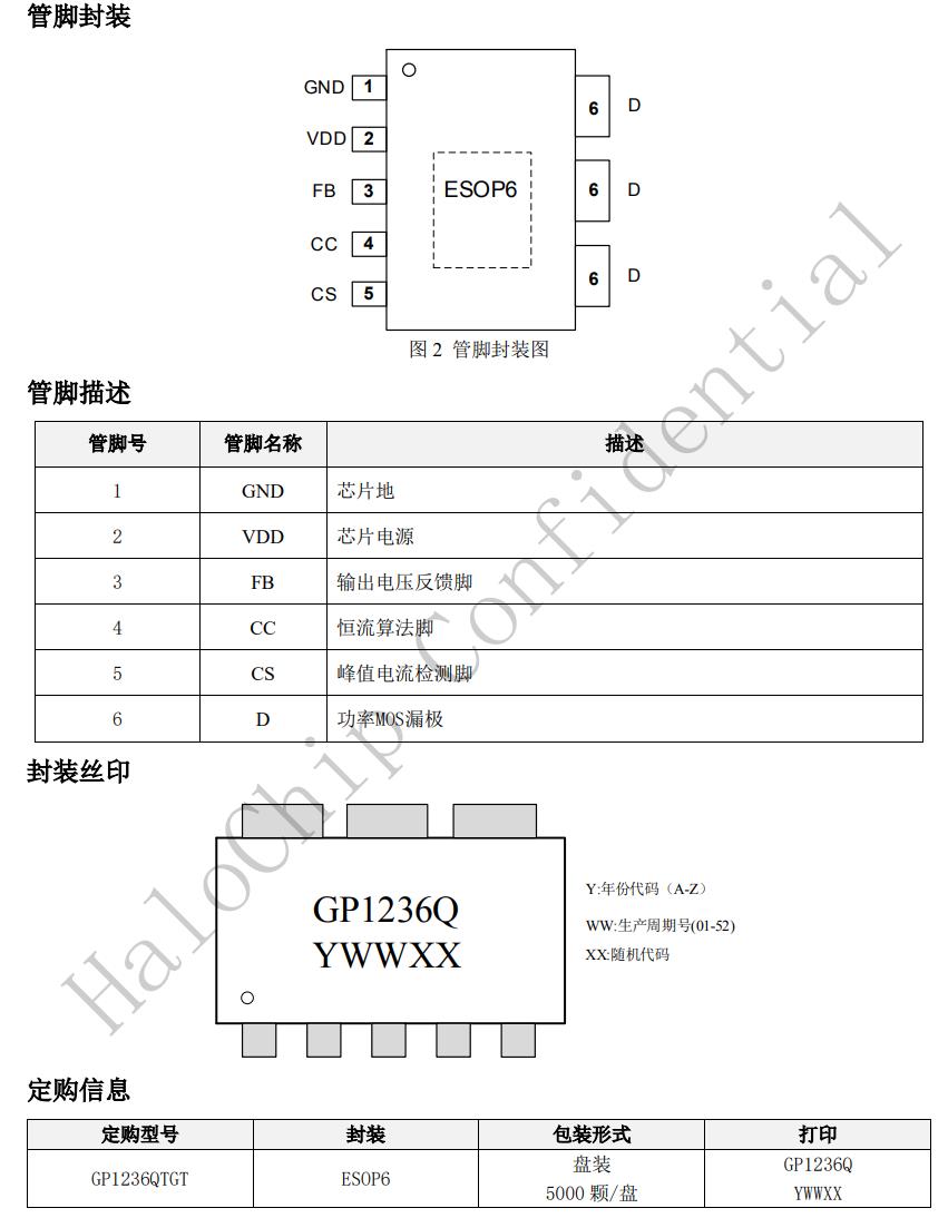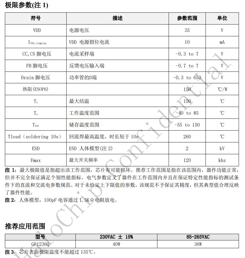 GP1236Q是一款高度集成的隔離型適配器和充電器的PSR內置MOSFET控制芯片。GP1236Q工作在QR導通模式,具有效率高,EMI特性好等優點。輸出線損補償可以調,可以實現良好的空滿載輸出電壓曲線。