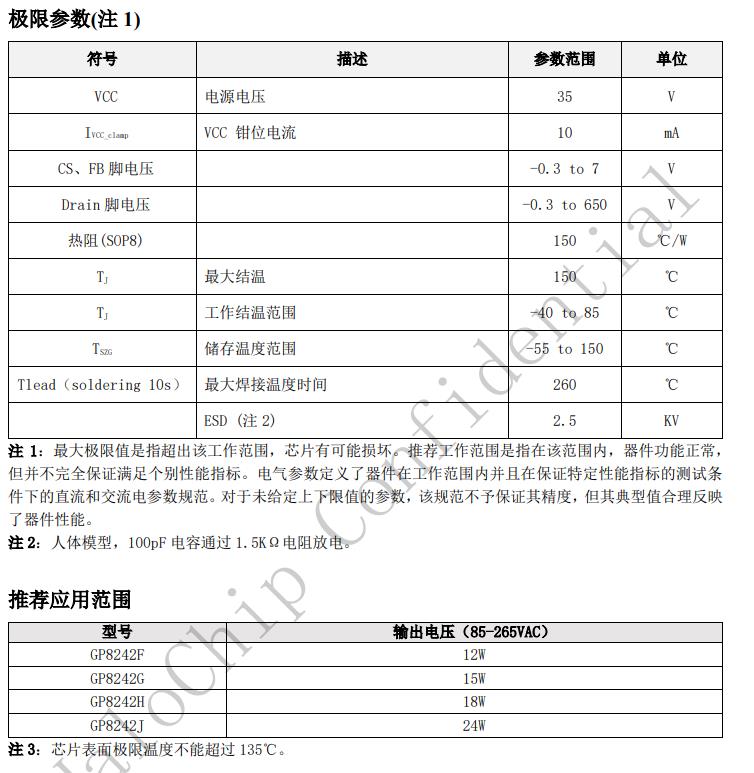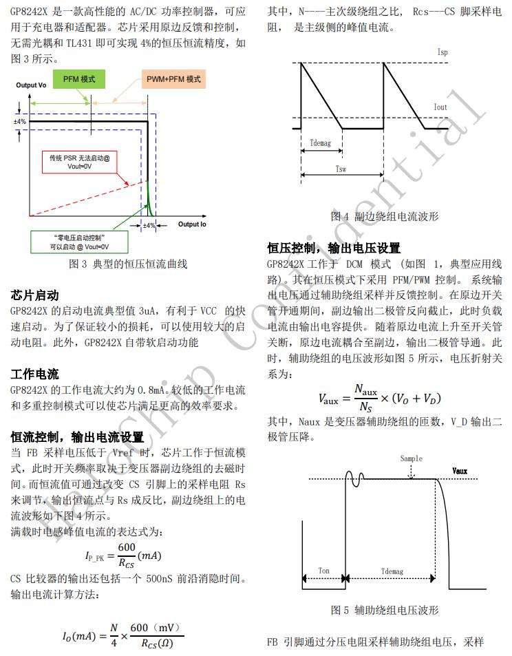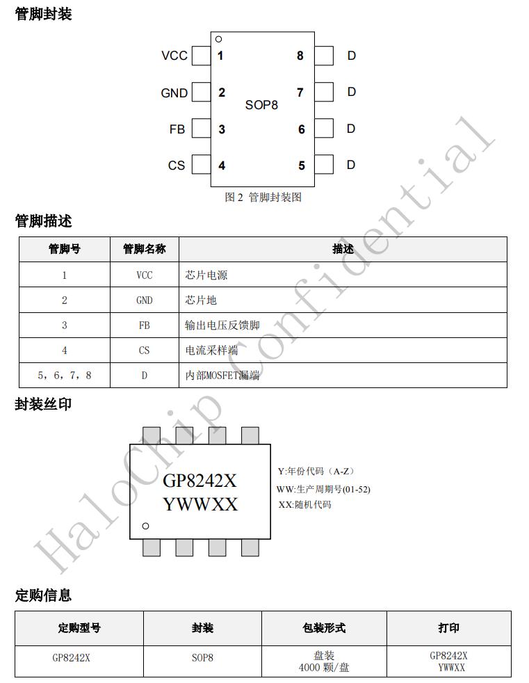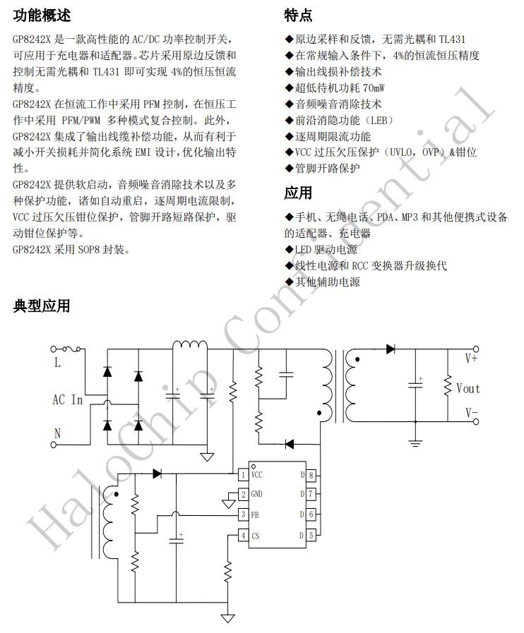GP8242X是一款高性能的AC/DC功率控制開關,可應用于充電器和適配器。芯片采用原邊反饋和控制無需光耦和TL431即可實現4%的恒壓恒流精度。GP8242X在恒流工作中采用PFM控制,在恒壓工作中采用PFM/PWM多種模式復合控制。此外,GP8242X集成了輸出線纜補償功能,從而有利于減小開關損耗并簡化系統EMI設計,優化輸出特性。GP8242X提供軟啟動,音頻噪音消除技術以及多種保護功能,諸如自動重啟,逐周期電流限制,VCC過壓欠壓鉗位保護,管腳開路短路保護,驅動鉗位保護等。GP8242X采用SOP8封裝。