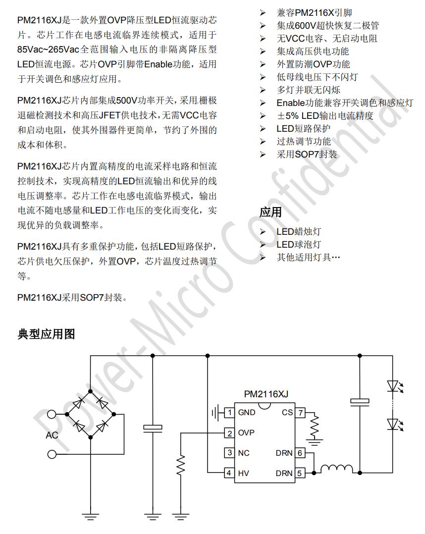 PM2116XJ是一款外置OVP降壓型LED恒流驅動芯 片。芯片工作在電感電流臨界連續模式,適用于 85Vac~265Vac全范圍輸入電壓的非隔離降壓型 LED恒流電源。芯片OVP引腳帶Enable功能,適用 于開關調色和感應燈應用。