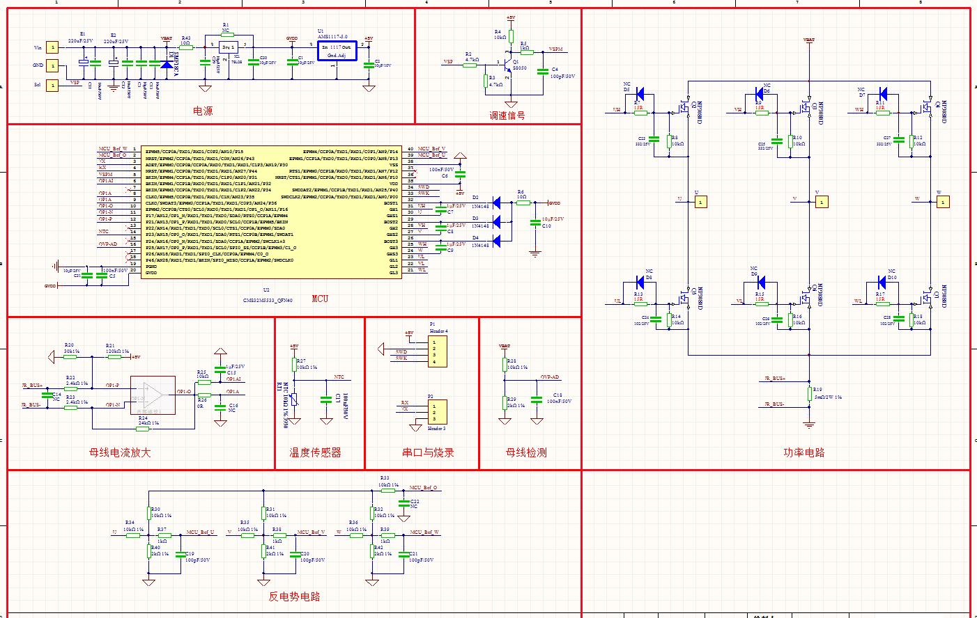 運放電流采樣按差分走線,從 Rsense 焊盤中間出線,走線遠離干擾源。 運放基準地應(yīng)與 MCU 為同一參考地,反電動勢采樣地與 MCU 為同一參考地。 敏感弱電信號線與強電或高頻信號線保持一定距離,例如: U, V, W,相線禁止從芯片底部走線。 輔助電源從輸入 Bulk Capacitor 出線。